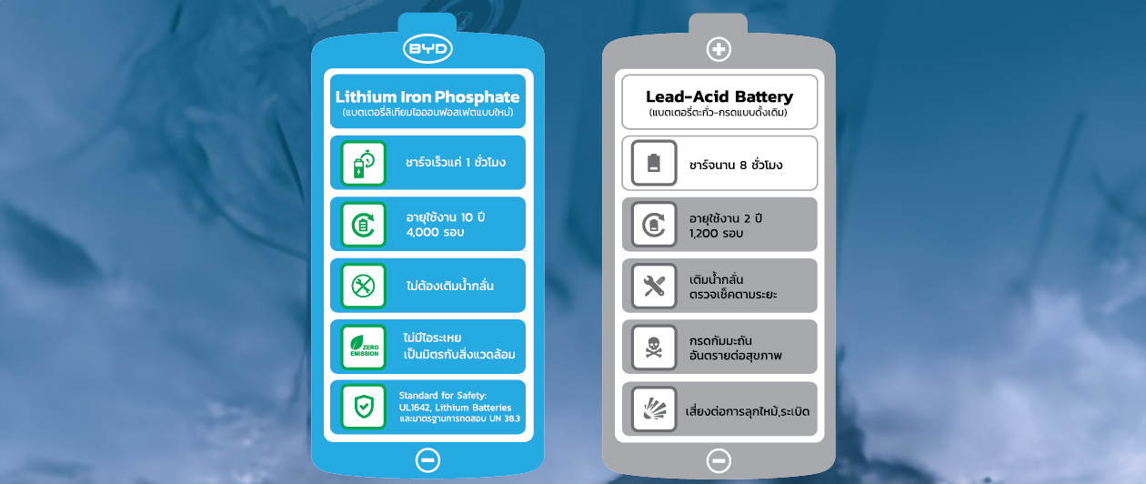 | รายละเอียด | แบตฯ ลิเทียมไอออนฟอสเฟตแบบใหม่ | แบตเตอรี่ตะกั่ว-กรดแบบดั้งเดิม |